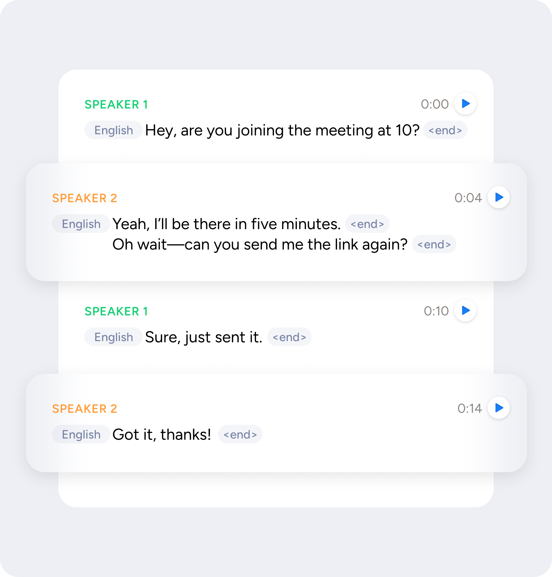 "Soniox knows who’s speaking and when each thought ends. The real-time transcripts read like true dialogue, not data dumps."